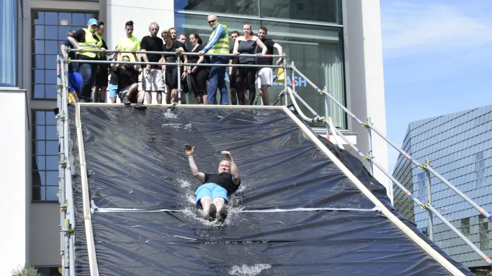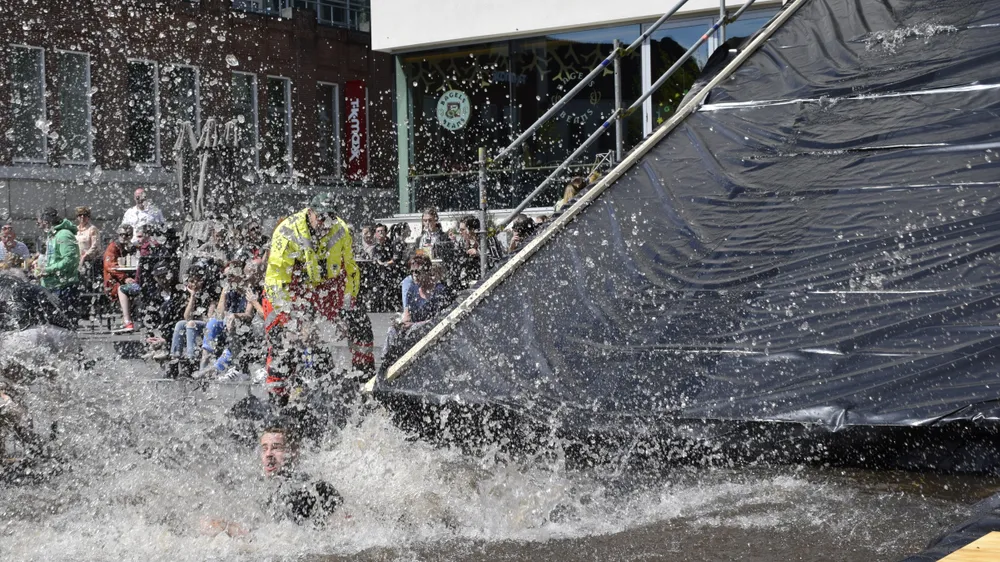 En via de ingang van Berden aan de Honigmannstraat gingen de meest dapperen naar de derde verdieping van het warenhuis om vervolgens via een mega-waterschans in een waterbak op de begane grond terug te keren.