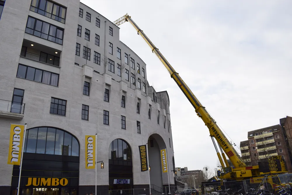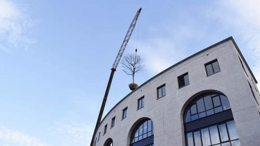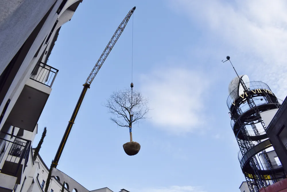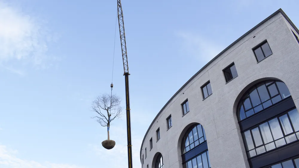 Onder ideale weersomstandigheden werden de bomen, die per stuk een kleine 6000 kilo aan de haak brachten, vervolgens stuk voor stuk met een grote mobiele kraan over het appartementencomplex gehesen om op het Maanplein hun wortels voor goed in de grond te mogen planten.