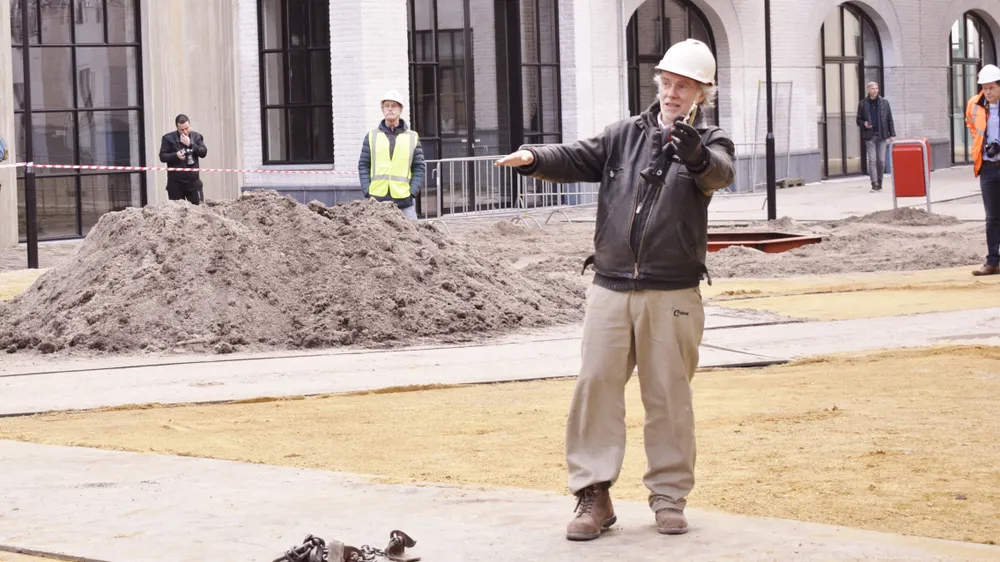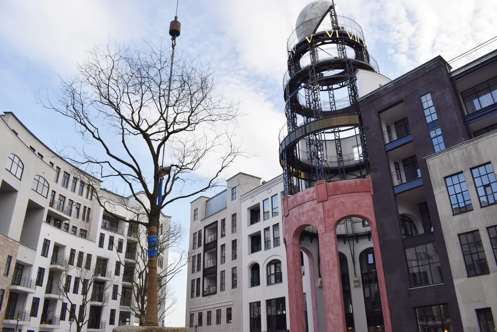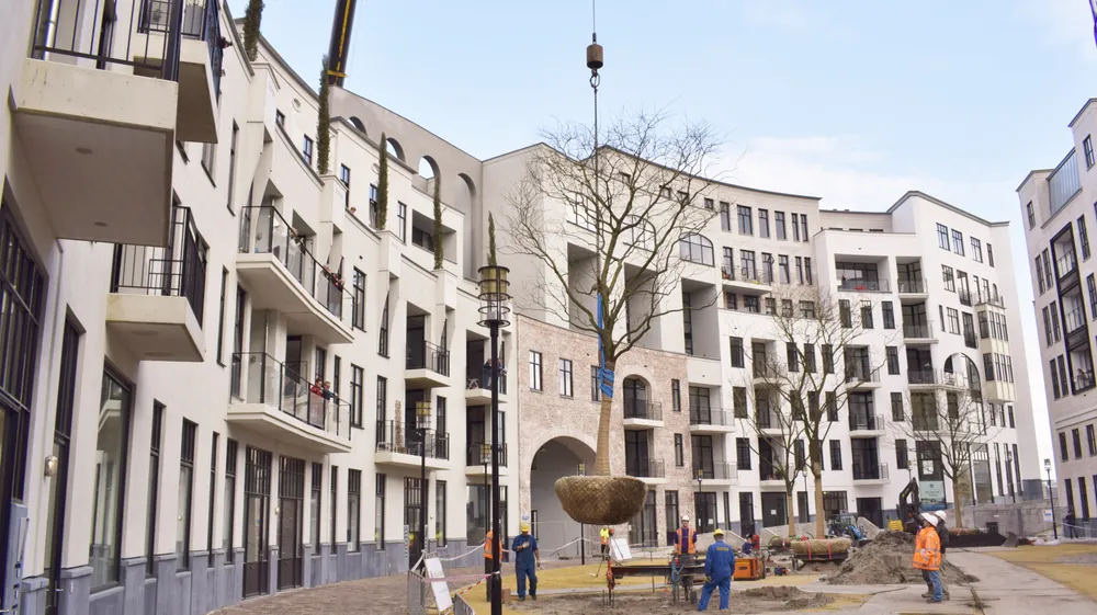 Onder het toeziend oog van Michel Huisman, de ontwerper van Maankwartier, werden de bomen netjes rechtgezet in een stalen krans.